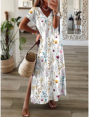 Damen Maxi Kleid A-Linie Kleid Sommerkleid Elegant Urlaub Urlaub Täglich Reguläre Passform Floral Grafik Kurzarm V-Ausschnitt Weiß Sommer Frühling Herbst