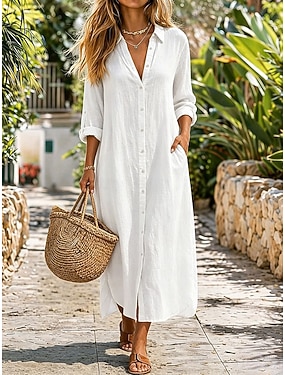 Damen Maxikleid Baumwoll-Leinen-Kleider Shiftkleid Basic Täglich Lässiger Schnitt Einfach Langarm Hemdkragen Schwarz Weiß Leicht Braun Orange Sommer Frühling Herbst