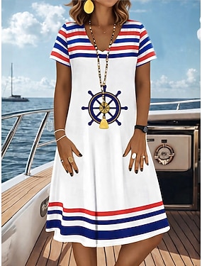 Amerikanischer Unabhängigkeitstag Damen Minikleid A Linie Kleid Urlaub Lässig Strand Normale Passform Grafik Flagge Kurzarm V Ausschnitt Schwarz Weiß Rote Sommer Frühling