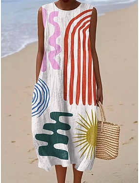 Damen Midikleid Shiftkleid Sommerkleid A Linie Kleid Urlaub Lässig Boho Strand Ausgehen Lässiger Schnitt Grafik Geometrisch Abstrakt Ärmellos Rundhalsausschnitt Weiß Gelb Grün Khaki Sommer Frühling