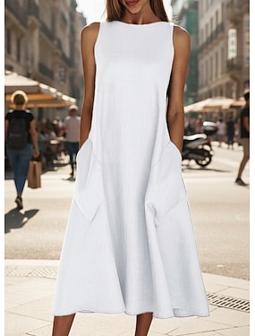 Damen Midikleid ärmellos Taschen lässig A-Linien-Silhouette runder Ausschnitt weiß sommerlich vielseitig normale Passform bequem leicht atmungsaktiv Kleidung