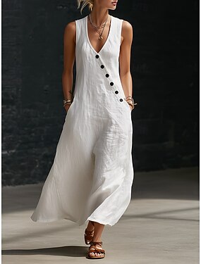 Damen Maxikleid Kunstbaumwollleinen Shiftkleid Sommerkleid Lässig Täglich Lässiger Schnitt Einfach Ärmellos V Ausschnitt Blau Schwarz Weiß Rote Sommer Frühling