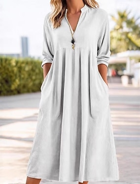 Damen Midikleid Kunstbaumwollleinen A Linie Kleid Lässig Täglich Normale Passform Einfach Dreiviertelarm Rundhalsausschnitt Blau Weiß Rosa Wein Sommer Frühling Herbst