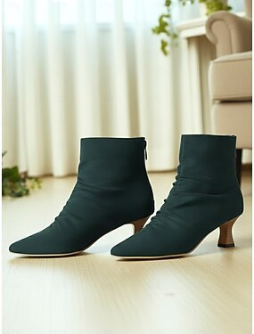 Schwarze Damenstiefeletten aus Kunstleder mit spitzer Spitze, gerüschtem Design und Kitten Heels – elegante Stiefeletten im Vintage-Stil für herbstliche Büro-Outfits und Abendgarderobe
