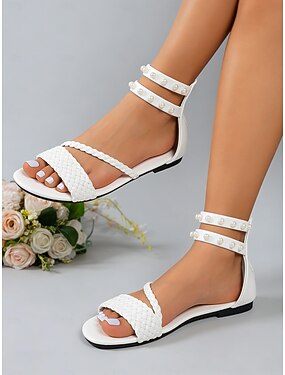 Weiße Brautsandalen für Damen – elegante flache Hochzeitsschuhe mit Perlen &Rüschen