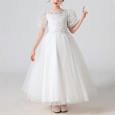 Blumenmädchenkleid Mädchen Prinzessinenkleid Kleid für die Erstkommunion Party Kleid Leistung Hochzeit Party Prinzessin Süß Gitter Feste Farbe Kurzarm Rundhalsausschnitt Weiß 2-12 Jahre
