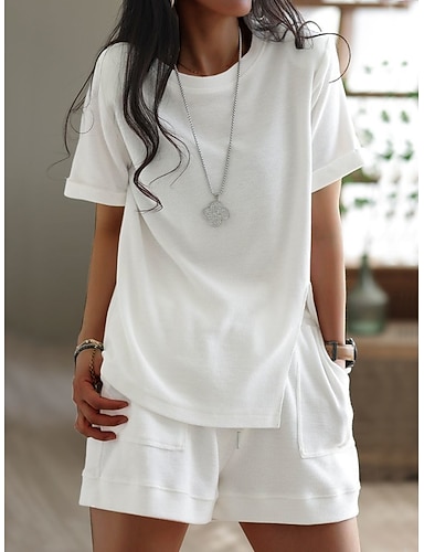 Loungewear-Sets für Damen in Übergröße, einfarbig, sportlich, lässig, bequem, für zu Hause, auf der Straße, täglich, atmungsaktiv, Rundhalsausschnitt, kurzärmliges T-Shirt, Shorts, Tasche, Sommer,