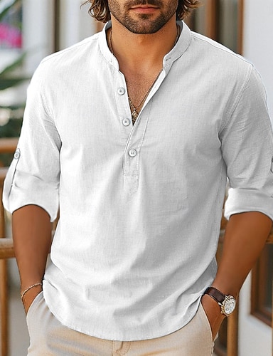 Herren Leinenhemd Popover-Hemd Freizeithemd Strandhemd Stehkragenhemd Einfach Urlaub Hawaiianisch Schwarz Weiß Rosa Orange Langarm Henley Frühling & Sommer Bekleidung Ärmel hochkrempeln
