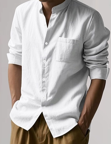 Herren Hemd leinenhemd Hemd mit Stehkragen Sommerhemd Strandbekleidung Glatt Casual Täglich Weiß Blau Khaki Langarm Kragen Frühling Sommer Bekleidung