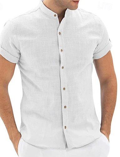 Herren Hemd Leinenhemd Stehkragenhemd Popover-Hemd Sommerhemd Strandbekleidung Einfarbig Urlaub Straße Weiß Marineblau Himmelblau Kurzarm Mandarinkragen Sommer Frühling Bekleidung