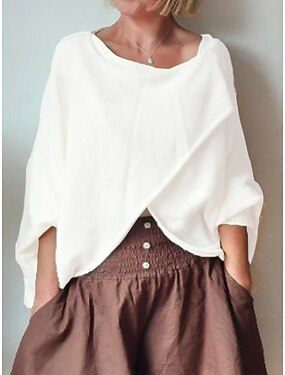 Damen Oberteil mit Spitzenspleiß Leinen-T-Shirt Falten Einfarbig Vintage Stilvoll Lässig Langarm U-Boot-Ausschnitt Normale Oberteile Täglich Ausgehen Salbeigrün Schwarz Weiß Staubiges Blau Leicht Blau