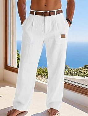 Herren Leinenhose Hose Hosen Sommerhosen Strandhose Vordertasche Gerade geschnitten Glatt Komfort Atmungsaktiv Casual Täglich Festtage Modisch Designer Weiß Blau