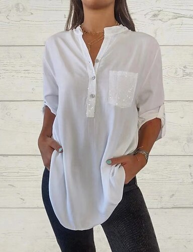 Damen Hemd Pailletten Funkelnd Party Patchwork Einfarbig Langarm V Ausschnitt Normale Oberteile Rouge Schwarz Weiß Frühling Herbst