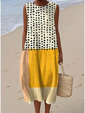 Damen Midi Kleid Leinenähnliches Sommerkleid Shift Kleid A-Linien Kleid Urlaub Freizeit Boho Ausgehen Strand Lockerer Schnitt Grafisch Geometrisch Ärmellos Rundhalsausschnitt Gelb Dunkelgrau