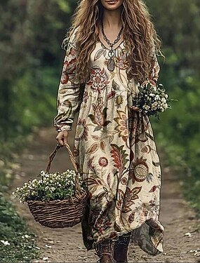 Damen Boho Kleid Blumen V-Ausschnitt Maxikleid Vintage Kleid Print Kleid Mode Modern Sommer Frühling