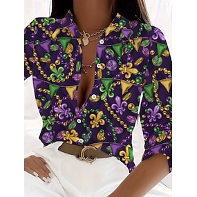 Mardi Gras Womens Bluse Leinenähnlich Atmungsaktiv Leicht Grafik Vintage Täglich Stylisch Lange Ärmel V-Ausschnitt Lange Oberteile Täglich Urlaub Druck Weiß Helllila Lila Sommer Frühling