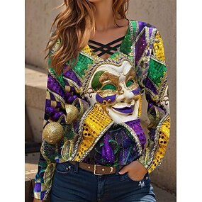 Karnival Karneval Damen T Shirt Ausschnitt Druck Grafik Abstrakt Vintage Stilvoll Klassisch Langarm V Ausschnitt Normale Oberteile Täglich Purpur Grün Sommer Frühling Herbst