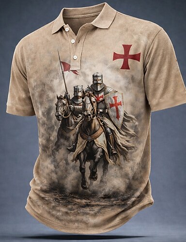 Herren Tempelritter Poloshirts Kurzarm Polo-Shirts Revers Vintage Lässig Straße Athleisure Alltagskleidung 3D-Druck Knöpfe Atmungsaktives Gewebe Sommer Frühling Schwarz Braun Grün