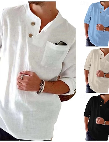 Herren Hemd leinenhemd Popover-Hemd Sommerhemd Strandbekleidung Durchgeknöpft Hemd Einfarbig Urlaub Straße Schwarz Weiß Blau Khaki Langarm Stehkragen Sommer Frühling Bekleidung