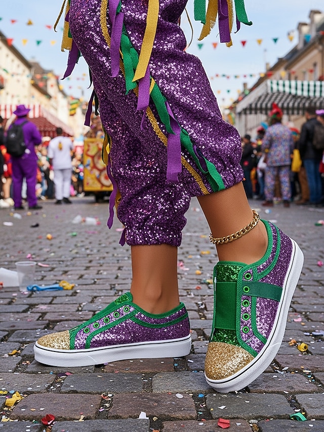 Damen Mardi Gras lilafarbene Glitzer Slip-on Sneaker – Pailletten Rave Schuhe für Musikfestivals Karnevalspartys gewagte Streetwear