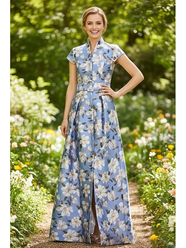 A-Linie Bodenlang Hemdblusenkleid Kleid für Hochzeitsgäste Abendkleid Brautmutterkleid Kappenärmel Hoher Ausschnitt Elegant Minimalistisch Formell Hochzeitsgast Satin mit Geteilter Vorderteil Druck #12030840