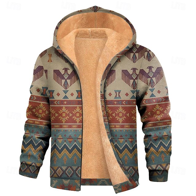 Herren Stammes Fleece Kapuzensweatshirt Jacke Pullover Ethnisch Klassisch Vintage-Retro Rundhalsausschnitt Outdoor Camping Blau Braun Reißverschluss Herbst Winter Designer S M L XL 2XL 3XL #12484709