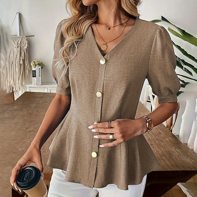 Damen Freizeithemd Knopfhemd Bluse Gerafft Tunika Knöpfe Einfarbig Einfach Elegant Täglich Stilvoll Kurzarm Puffärmel V Ausschnitt Normale Oberteile Ferien Strandbekleidung Urlaubskleidung Blau Kamel #12527749