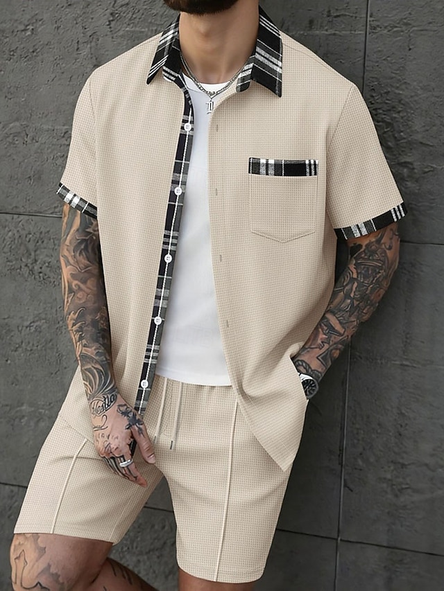 Herren Zweiteilig Hemd Set Sommer-Set Und Set Kontrastfarbe Lässig Täglich Urlaub Hemdkragen Kurzarm Kurze Hose Sommer Frühling Mode Lässig Bequem Bekleidung#13260539