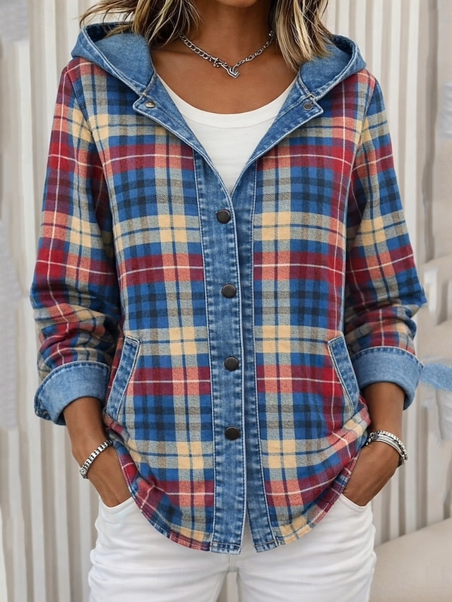 Damen Freizeitjacke Kapuzenjacke Warm Bequem Reißverschluss Tasche Knöpfe Lässig Karomuster Heim Outdoor Urlaub Alltagskleidung Regulär Mit Kapuze Lässiger Schnitt Langarm Oberbekleidung Blau Herbst #13455237