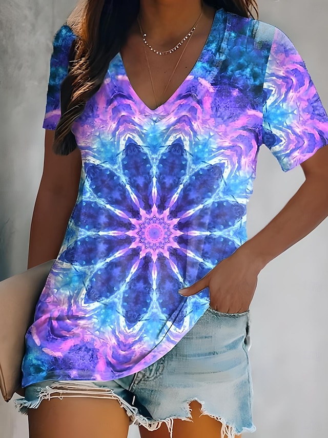 Damen T-Shirt Sommer Tops Batik lässig ärmellos Kurzarm V-Ausschnitt reguläre Tops täglicher Druck blau lila fuchsia hellblau sommer frühling #14154476
