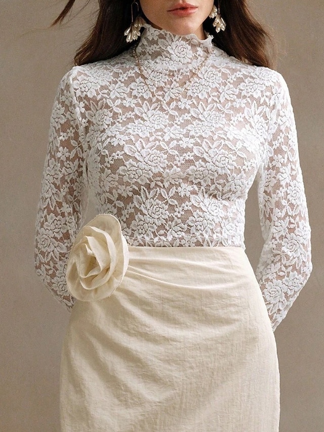 Damen Bluse Spitzentops Spitze Einfach Stilvoll Langarm Rollkragen Normale Oberteile Täglich Ferien Ausgehen Weiß Frühling Herbst #14307773