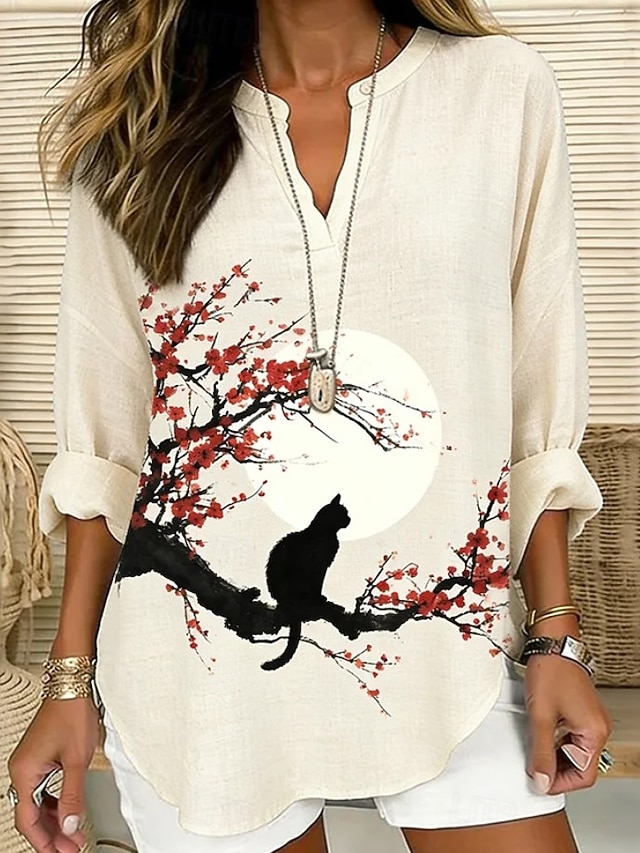 Damen Bluse Gerafft Bestickt Druck Ombre Grafik Geometrisch Vintage Tropisch Hawaiianisch Langarm V Ausschnitt Lange Oberteile Täglich Ferien Urlaubskleidung Blau Weiß Beige Sommer Frühling#17007976