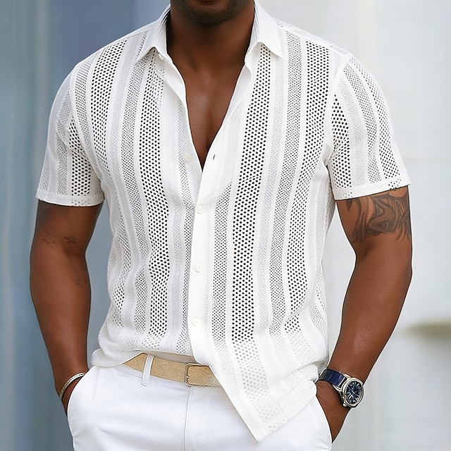 Herren Hemd Sommerhemd Knopfhemd Jacquard-Hemd Strickjacke Schwarz Weiß Kurzarm Texture Mode Revers Lässig Heim Loch Bekleidung Modern Moderne zeitgenössische Lässig#17774963