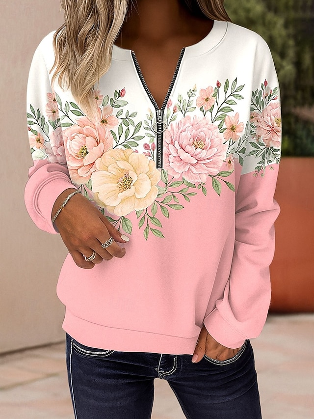 Damen Pullover Sweatshirt Sweatshirts mit Reißverschluss Reißverschluss Druck Blumen Grafik Mode Lässig Langarm Rundhalsausschnitt Normale Oberteile Straße Alltagskleidung Blau Rosa Purpur Grün #18074986