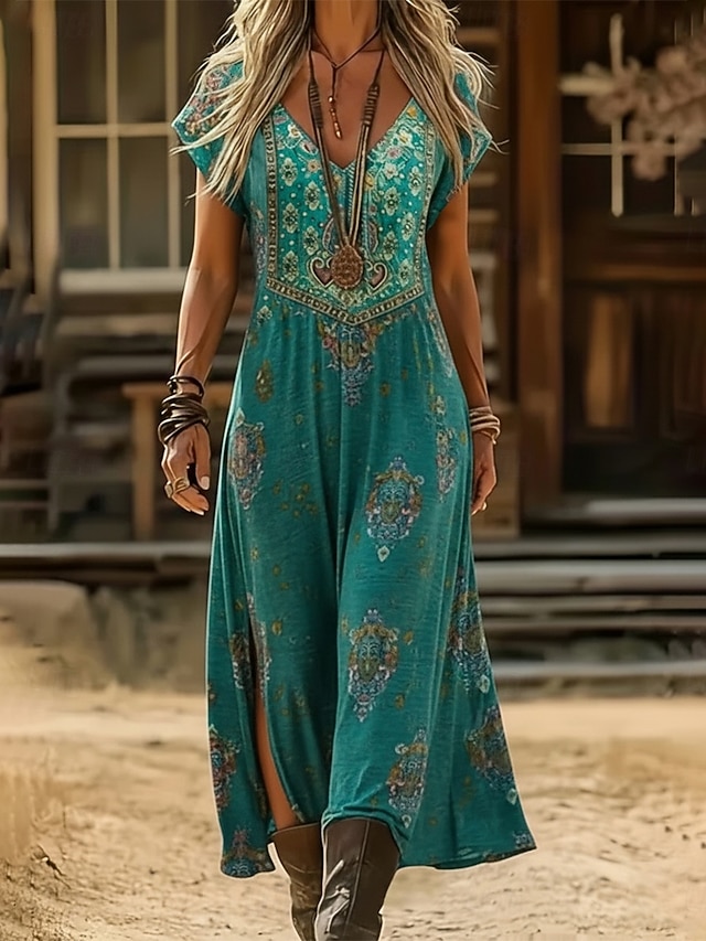 Kleiderarten:Druckkleid,Boho-Kleid,Freizeitkleid,A Linie Kleid,Stoff:Polyester,Geschlecht:Damen,Design:Druck,Geteilt,Anlass:Urlaub,Outdoor,Wochenende,Stil:Vintage,Passform:Normale Passform,Kleid Länge Typ:Midikleid,Ausschnitt:V Ausschnitt,Ärmellänge:Kurzarm,Elastizität:Unelastisch,Pflegetipps:Handwäsche,Maschinenwäsche,Muster:Grafik,Blumen,Saison:Sommer,Frühling,