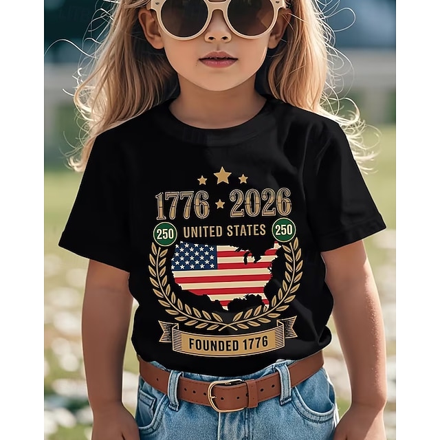 100% Baumwolle Kinder Mädchen Schwarz Grafik USA Flagge 250-jähriges Jubiläum Amerikanische US-Flagge für Kinder T-Shirt Rundhalsausschnitt Kurzarm Urlaub Sport & Outdoor Alltagskleidung Aktiv Urlaub #19152844
