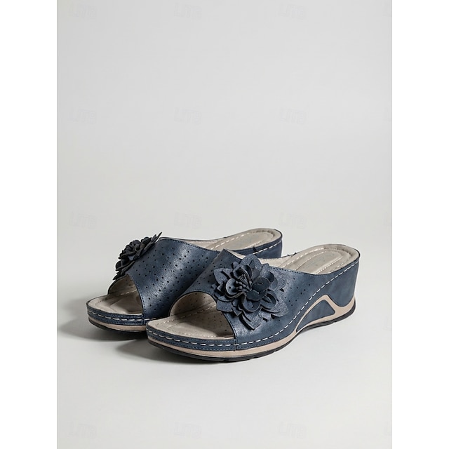 Offene Damen-Sandalen zum Hineinschlüpfen mit Keilabsatz und Blumendekor – atmungsaktiv, bequem und stylisch für den lässigen Sommerlook #8666559