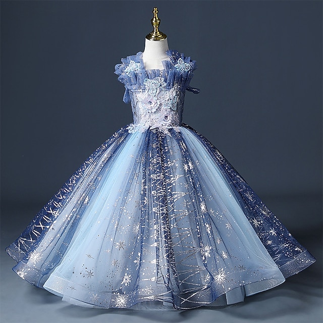 Blumenmädchenkleid Mädchen Kleid Prinzessinenkleid Party Kleid Formal Hochzeit Party Prinzessin Süß Gitter Bestickt Blumen Ärmellos Schulterfrei Leicht Blau 3-12 Jahre#9040429