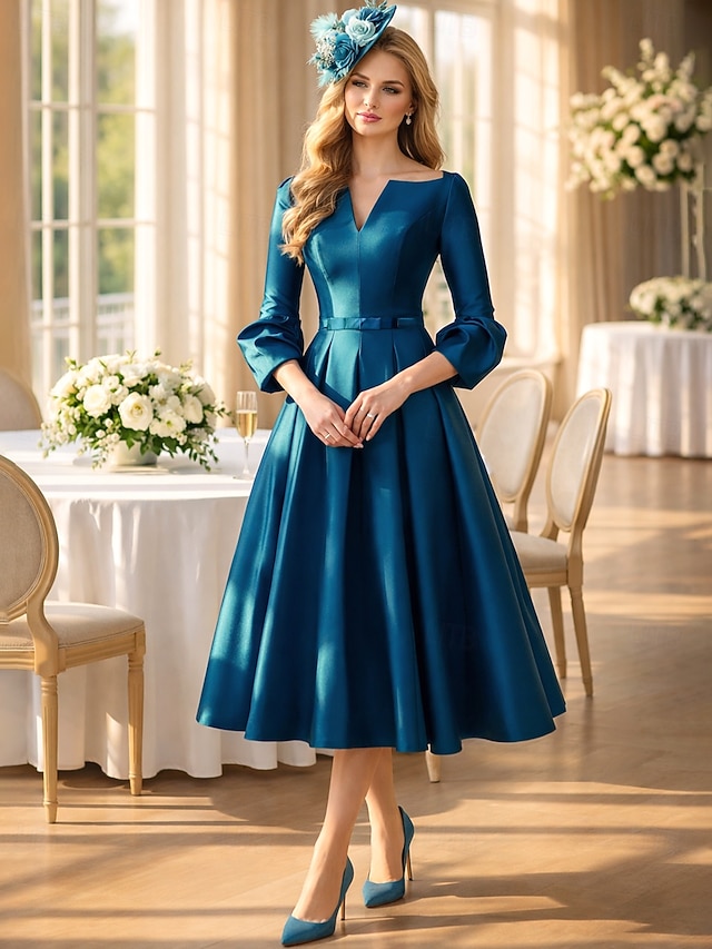 A-Linie Tee-Länge Cocktailkleider Partykleider Elegant Mutter Dreiviertelarm V Ausschnitt Formell Hochzeitsgast Satin mit Falten #9514397