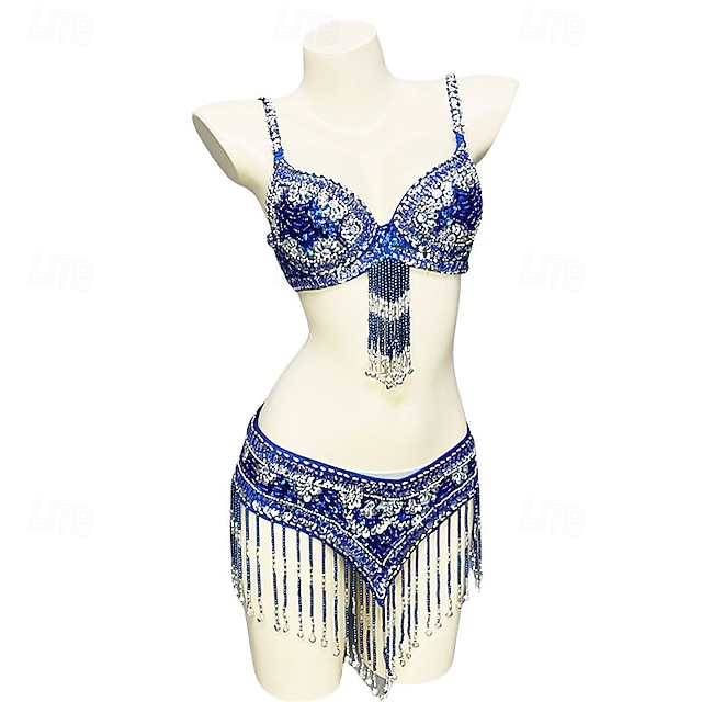 Samba Dancewear Tiefblaues Ornamental Beaded Pailletten Bauchtanz-Set Leistungskostüm #9826341