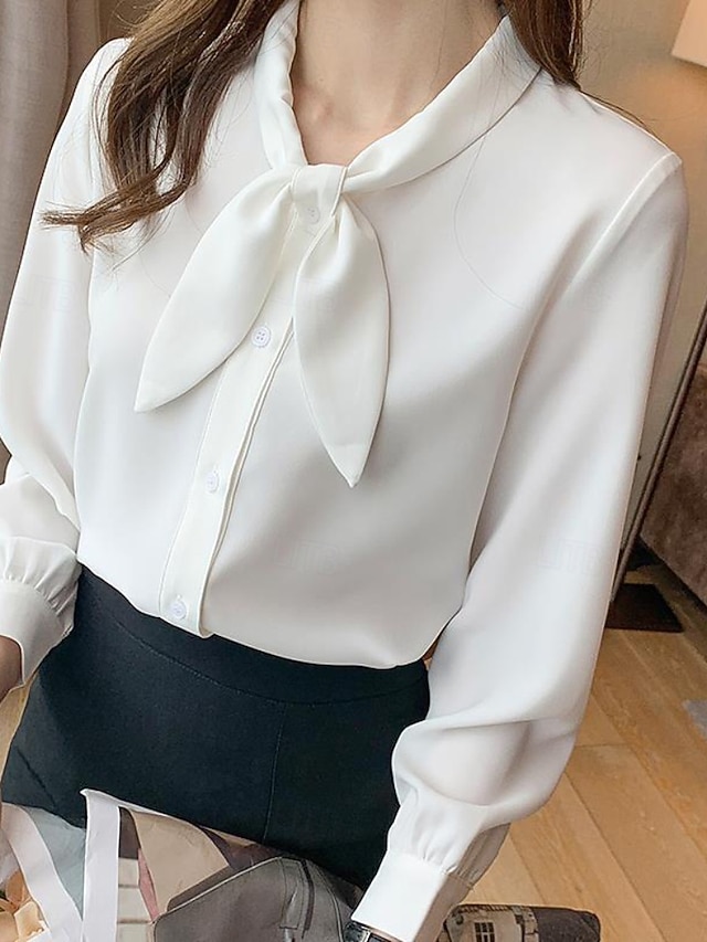 Damen Hemd Elegant Satin-Top Bluse Schleife Einfach Stilvoll Langarm Rundhalsausschnitt Normale Oberteile Ferien Ausgehen Blau Weiß Frühling Herbst #16498523