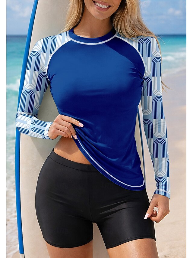 Damen Mittel Rash Guard Badeanzug Anti UV Shirt Tankini-Badeanzüge Geometrisch Farbblockierung 2 teilig Herausnehmbare Polsterung Boyleg UV-Sonnenschutz UPF50+ Elastisch Langarm Bademode Schutz gegen #13859256
