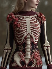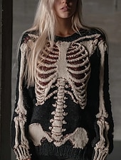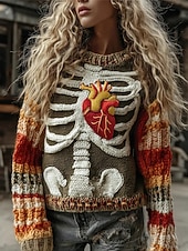 Halloween Damenpullover Skelett Mode Lässig Grafik Skelett Rundhalsausschnitt Patchwork Gestrickte Lange Ärmel Reguläre Oberteile Strick Schwarz Rosa Herbst Winter #18736874