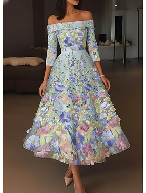 A-Linie Knöchellänge Cocktailkleider Elegant Vintage Blumen Halbarm Schulterfrei Gartenparty Hochzeit Satin Tüll Tiefer Wasserfall-Rückenausschnitt mit Gestickte Blume Falten Stickerei