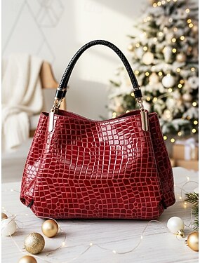 Weihnachtshandtasche für Damen aus Kunstleder mit Krokodilprägung, perfekt für die Feiertage, erhältlich in Rot, Blau und Schwarz – stilvolle Winter-Schultertasche mit verstellbarem Riemen und goldenen Akzenten