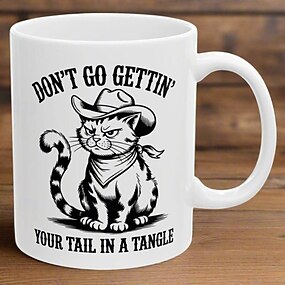 Lustige Geschenktasse: „Verheddere dich nicht mit deinem Schwanz!“ Witzige Westernkatzen-Tasse mit sarkastischem Spruch – ein einzigartiges Kaffeebecher-Shooting für Katzenliebhaber und Westernfans.