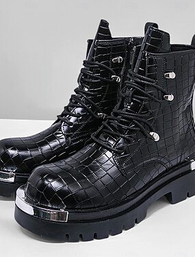schwarze Herren-Schnürstiefel mit Krokoprägung, dicker Sohle und Metallic-Details – stylisch für Motorradfahrer, urbane Streetfashion, Freizeitkleidung und Rock-Style