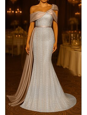 Schlauchkleid Bodenlange Schleppe Ballkleid mit Cape Abendkleid Festliche Kleidung Elegant Glitzernd Promi-Stil Langarm Rundhalsausschnitt Formell Hochzeit Stretch-Crêpe mit Schal