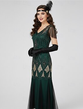 Set Retro Vintage Goldene Zwanziger 1920er Bodenlang Outfits Zubehörset Abendkleid mit Zubehör Kurze Ärmel Der große Gatsby Hochzeitsgast Pailletten Pailletten V Ausschnitt Kostüm Damen Karneval