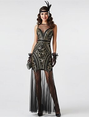 Set Retro Vintage Goldene Zwanziger 1920er Knöchellänge Lange Länge Cocktailkleid Flapper-Stirnband Weihnachtsfeier Kleid mit Zubehör Ärmellos Hochzeitsgast Pailletten Pailletten Rundhals